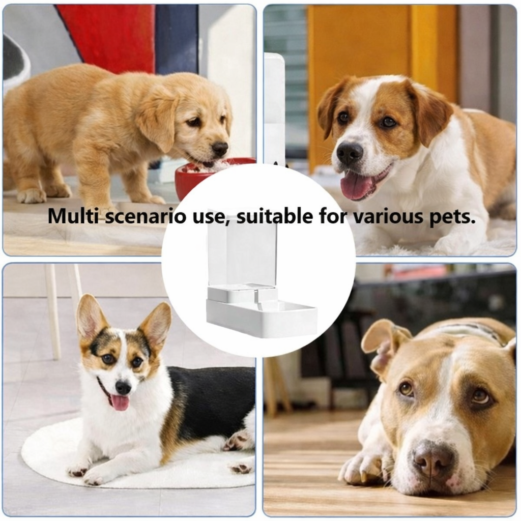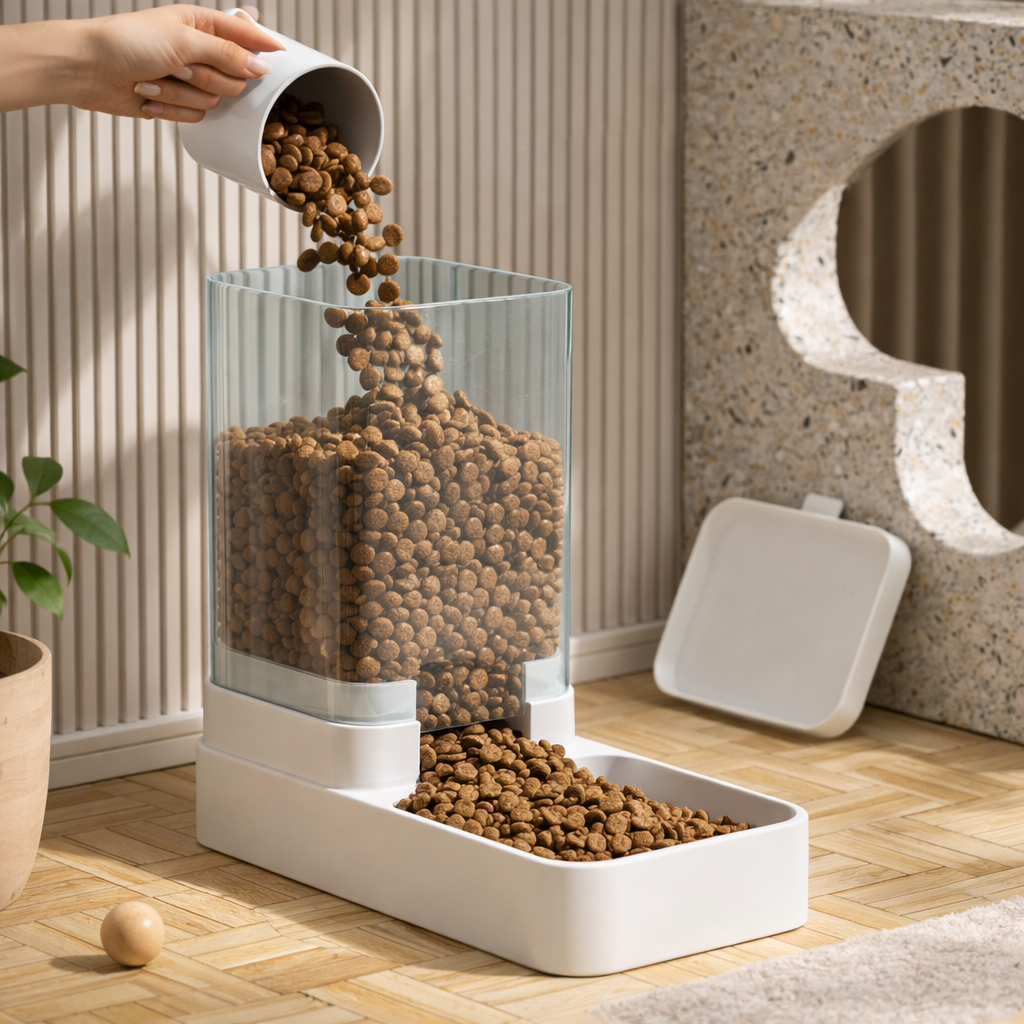 The food container automatically releases dry kibble into the feeding tray as your pet eats. The gravity-based design ensures a continuous supply of food throughout the day.