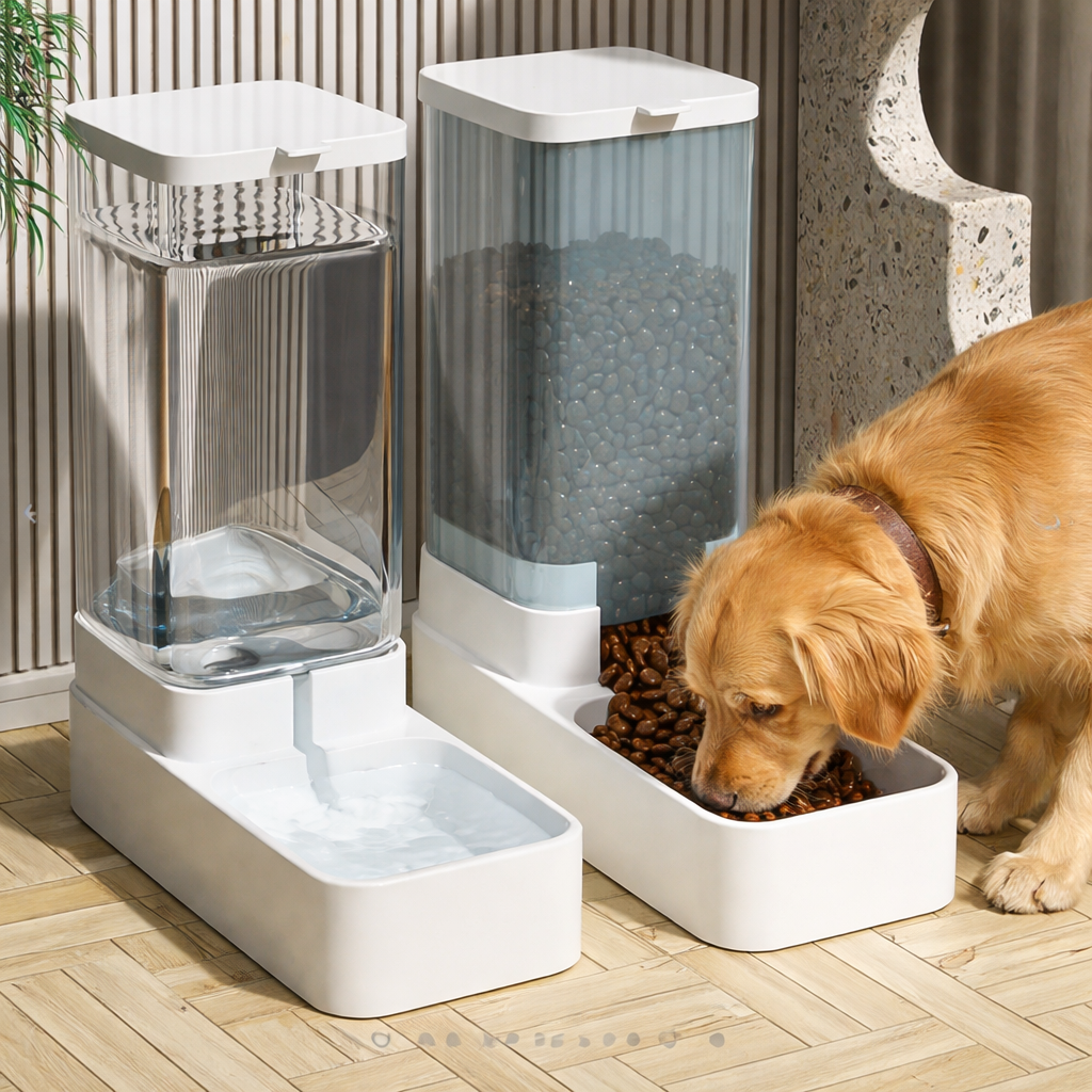 🐕 This modern Automatic Pet Dispenser Set includes two separate containers: one for water and one for dry food. Designed with a sleek, minimalist style, the dispensers are made from durable, pet-safe plastic with transparent storage tanks, allowing you to easily monitor the remaining water or food levels.